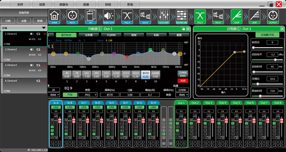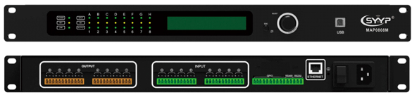 MAP0808M是一款8進8出的自動混音媒體矩陣,配備8路模擬輸入和8路模擬輸出,內(nèi)置反饋抑制,自動混音,矩陣混音,均衡器,分配器,壓縮器等DSP功能,通過USB免驅(qū)連接電腦軟件控制,RS232,TCP/IP連接中控遠程控制,適合用在各種場合的擴音工程。
