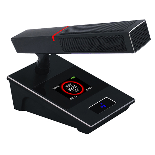 *話筒具備高強度防手機電磁波干擾設計,可以杜絕手機干擾噪音鄰頻干擾抑制; *主席話筒具備優先功能,一鍵關閉所有開啟中的代表話筒; *話筒具有IPS彩色顯示屏,特有廣視角、色彩艷麗,實時顯示話筒狀態:剩余電量、ID號、使用頻道以及發言時間計算; *內置大容量充電式鋰電池,一次充電可待機13小時,連續使用時間達8小時,話筒使用不分正反面TYPE-C接口充電,標配5V充電器(選配20孔充電機); *話筒表面使用啞光黑鋁合金面板,搭配黑色有機玻璃,銀白色倒邊,靚麗優雅,堅固耐用; *隱藏式簡潔話筒開關,防塵易清理,話筒打開后圖標亮起,具有持久耐用,按鍵清晰; *標配可插拔式配高強度陽極氧化工藝鋁合金方形短麥桿并帶有指示燈,開戶時亮