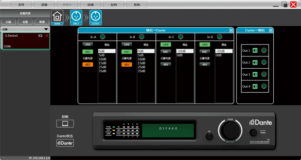 Dante數(shù)字網(wǎng)絡音頻技術是基于千兆以太網(wǎng)網(wǎng)絡傳輸?shù)臒o壓縮、專業(yè)級的數(shù)字音頻傳輸技術(AoIP)。Dante技術在音頻系統(tǒng)中支持數(shù)字音頻信號網(wǎng)絡傳輸?shù)脑O備甚至可達數(shù)十臺甚至上百臺,實現(xiàn)設備之前的數(shù)字信號互聯(lián)互通,并具有穩(wěn)定可靠的信號同步等功能。Dante網(wǎng)絡音頻接口盒可實現(xiàn)模擬音頻信號接入,轉換為數(shù)字音頻信號通過Dante協(xié)議接入到任意的Dante音頻傳輸網(wǎng)絡設備中,實現(xiàn)高品質。 ■遠距離、低延時的傳輸特性。 ■4路音頻平衡輸入4路音頻平衡輸出 ■拓撲方式靈活,支持擴展大批量發(fā)射端和接收端 ■采樣頻率24bit-44.1k/48k/96k ■MIC-48V/MIC/12dBu/22dBu四檔靈敏度可選 ■總諧波失真:〈0.005% ■信噪比:>92dB (-20dBu@1KHz) ■動態(tài)范圍:>92dB (-12dBu@1KHz) ■底噪:<-92dBu(MIC/48V:-81dBu) ■工作電壓:DC12V;工作電流:800mA ■頻率響應:20Hz-20KHz@±0.3dB((MIC/48V:20Hz-20KHz@±1.5dB)